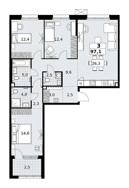 Количество комнат: 3, 97.1 кв.м.