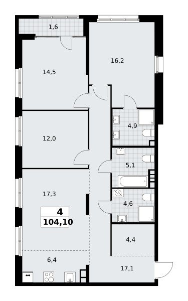 Площадь (общ/жил/кух), м2: 104.1/—/6.4