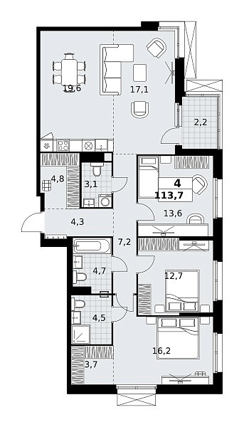Количество комнат: 4, 113.7 кв.м.
