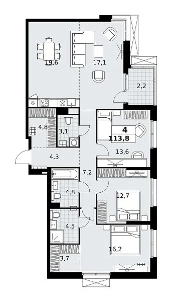 Площадь (общ/жил/кух), м2: 113.7/—/19.6