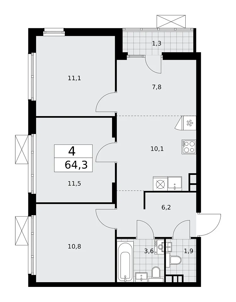 Количество комнат: 4, 64.3 кв.м.