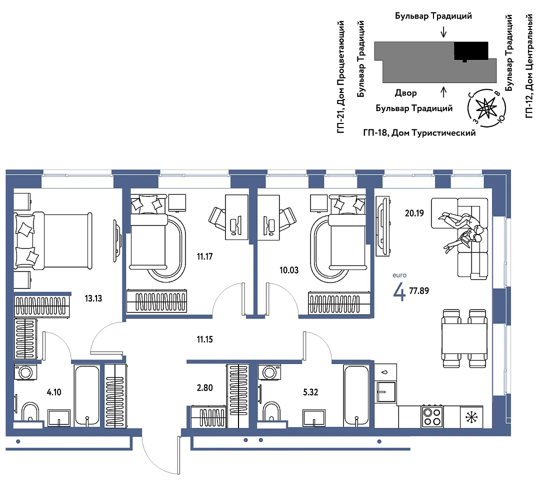 Купить новую четырехкомнатную квартиру 77.89 м² на 5/11 этаже в ЖК «Домашний», г. Тюмень за 11652632 ₽ | Агентство недвижимости «Вплюсе.Топ» — Недвижимость России