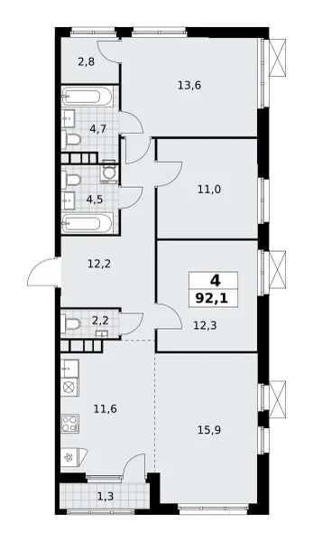 Площадь (общ/жил/кух), м2: 92.1/—/11.6