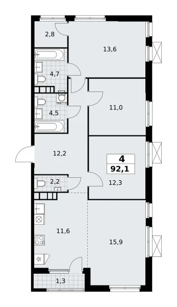 Площадь (общ/жил/кух), м2: 92.1/—/11.6