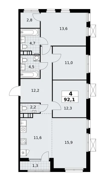 Площадь (общ/жил/кух), м2: 92.3/—/11.5