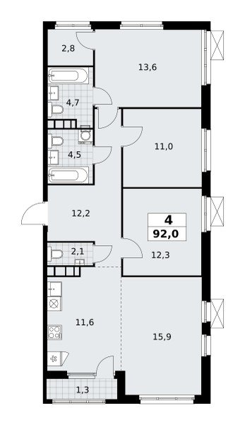 Площадь (общ/жил/кух), м2: 92/—/11.6