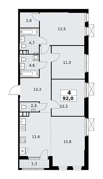 Площадь (общ/жил/кух), м2: 92.1/—/11.6