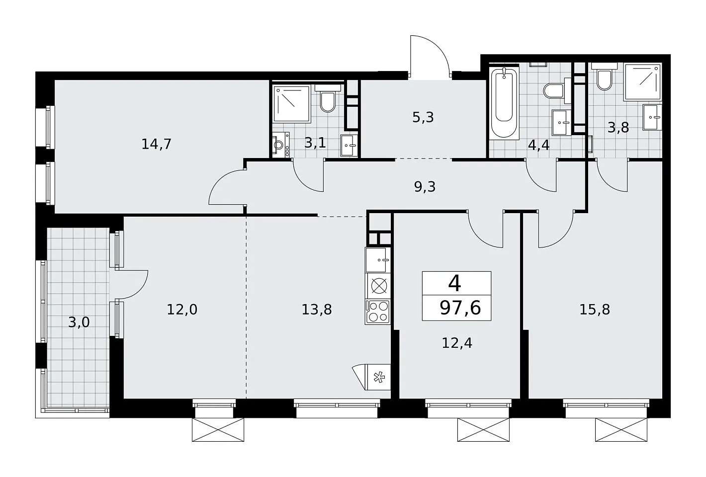 Площадь (общ/жил/кух), м2: 97.6/—/13.8