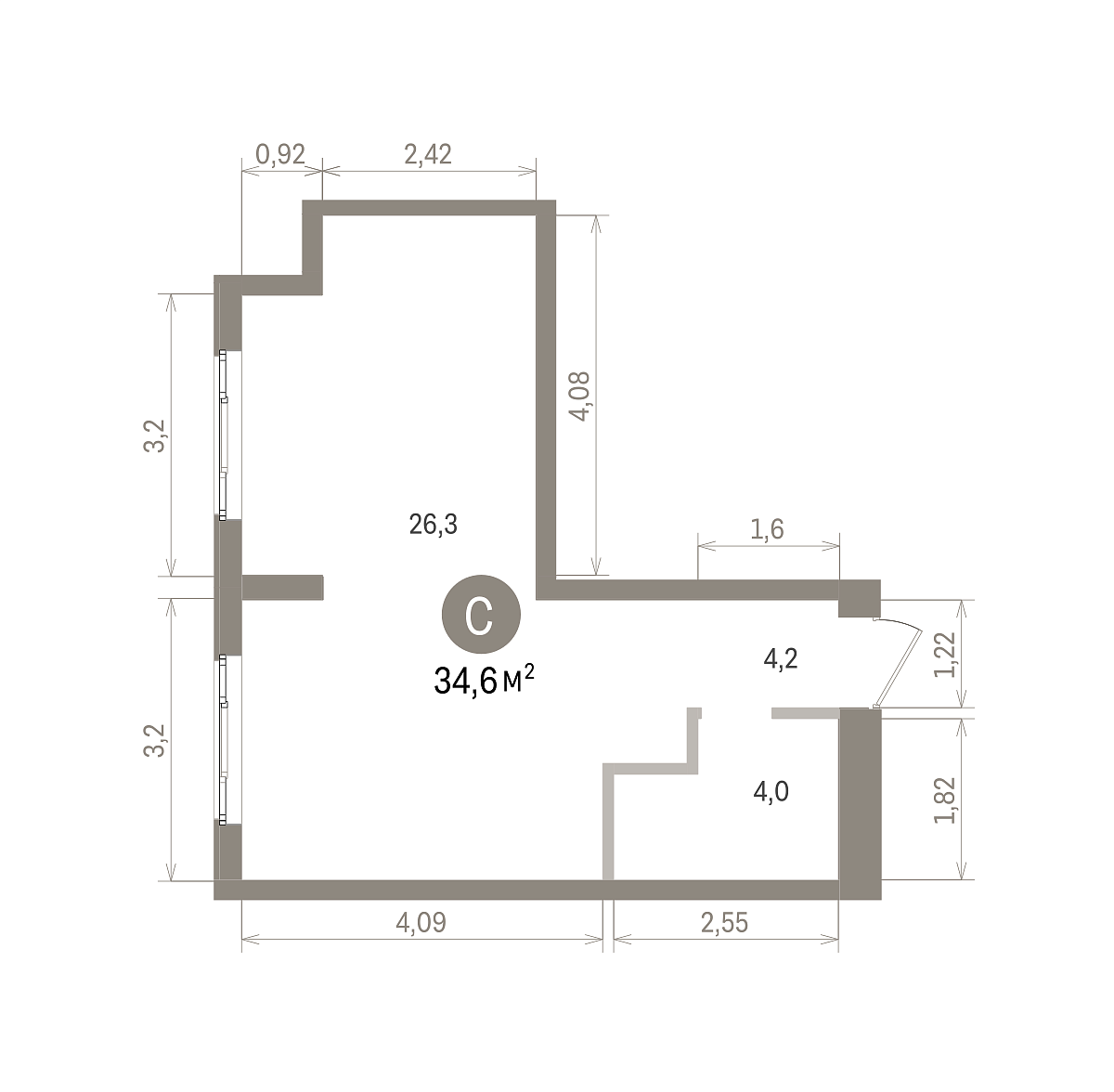 Общая площадь 34.55 м2