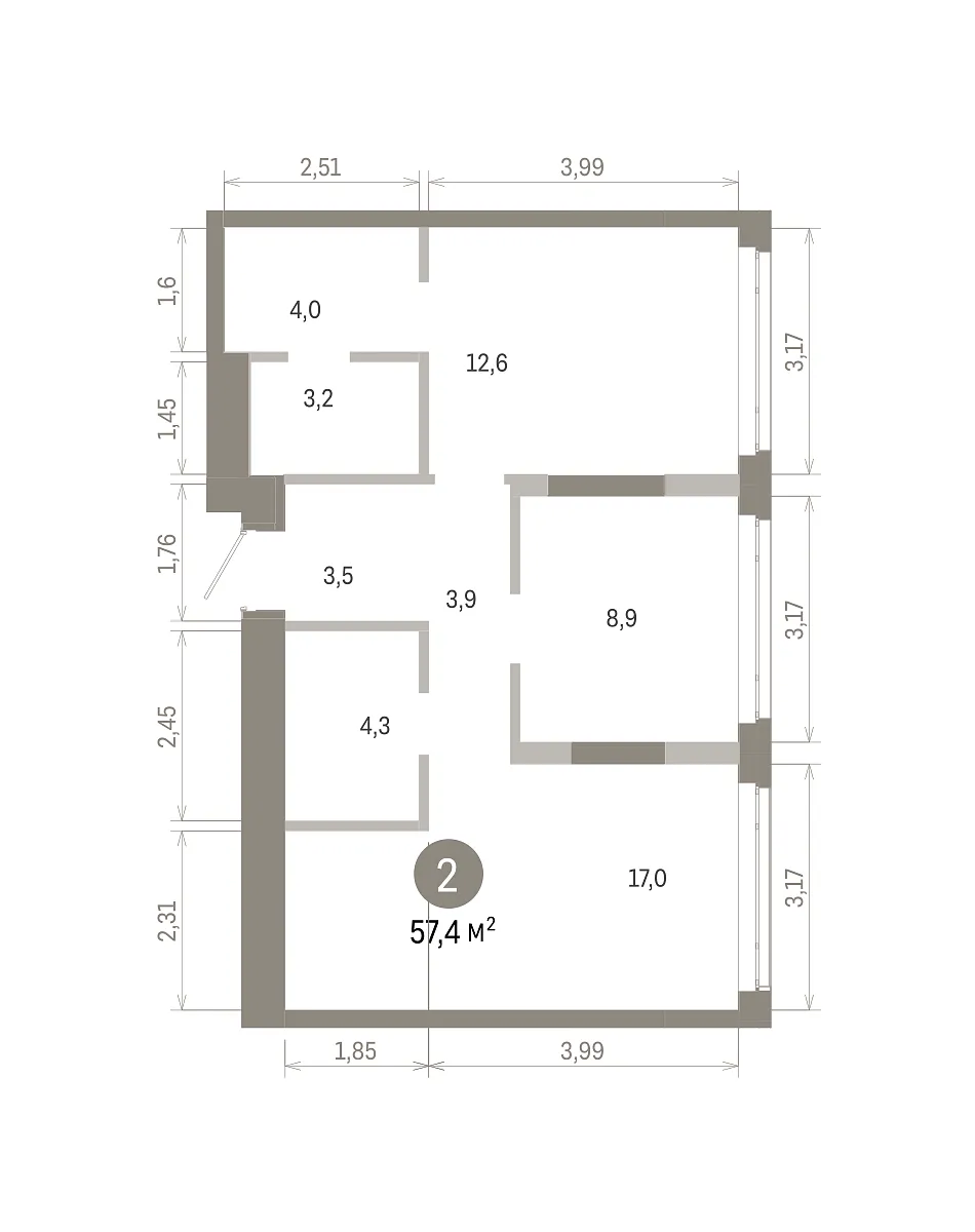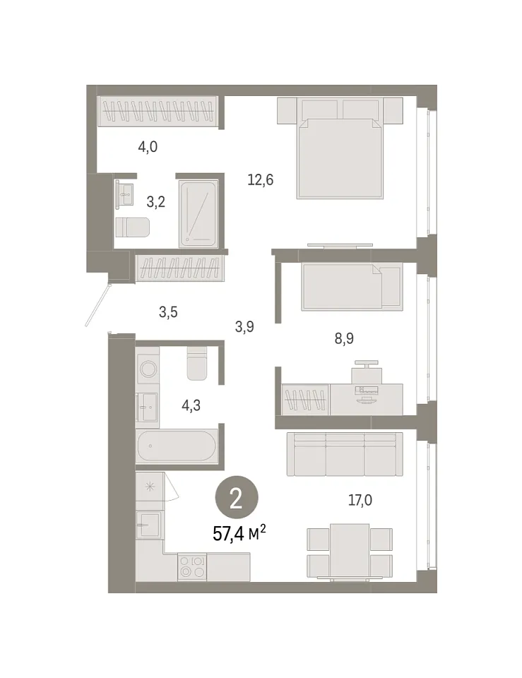 Площадь (общ/жил/кух), м2: 57.4/21.54/16.98