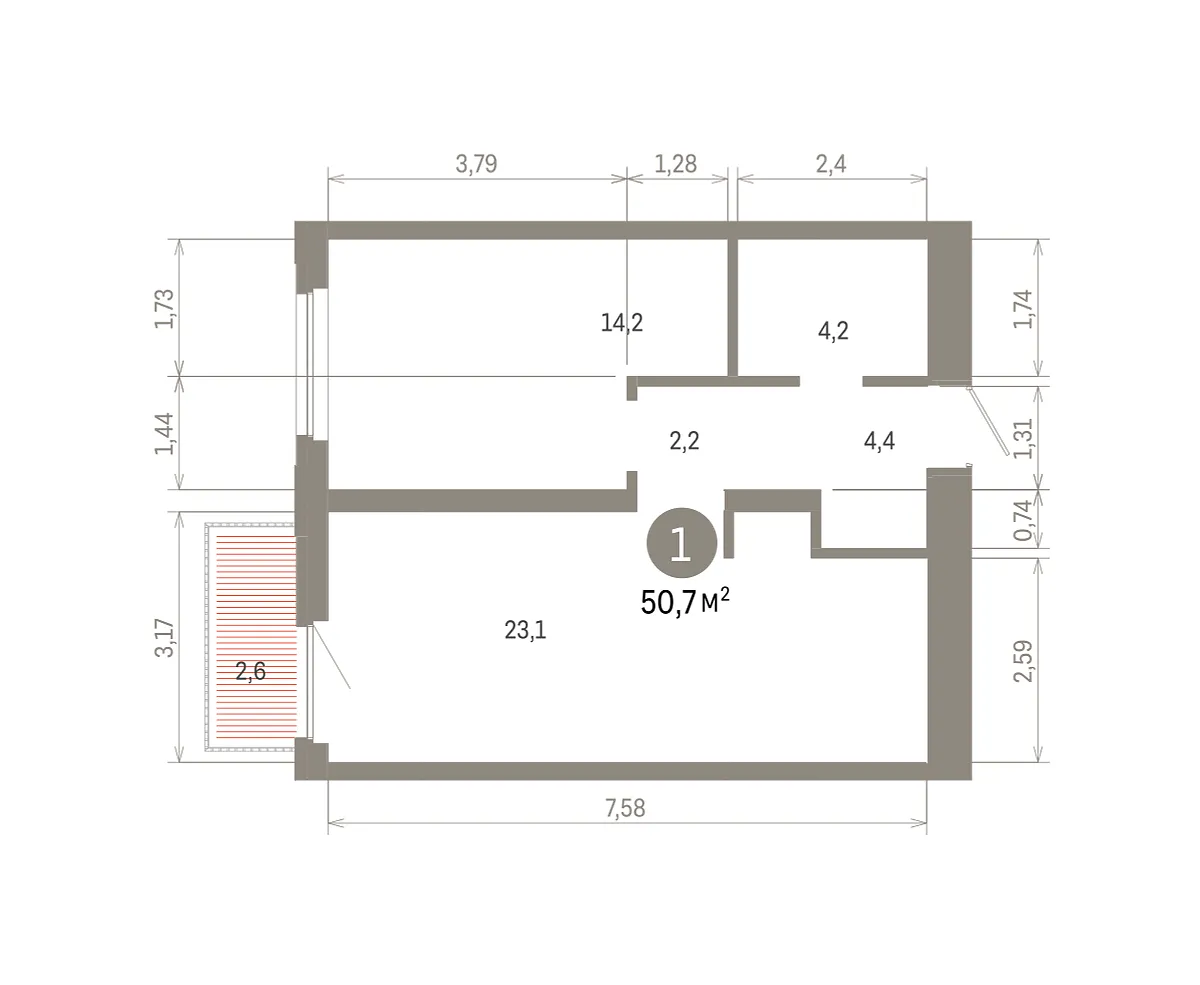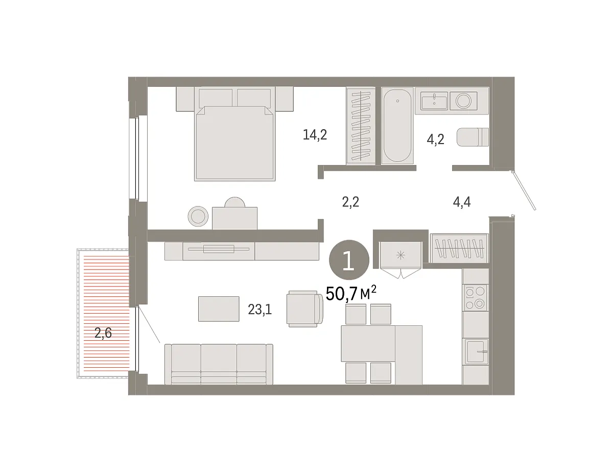 Площадь (общ/жил/кух), м2: 50.66/14.21/23.12