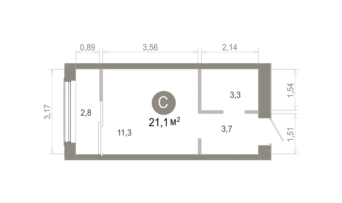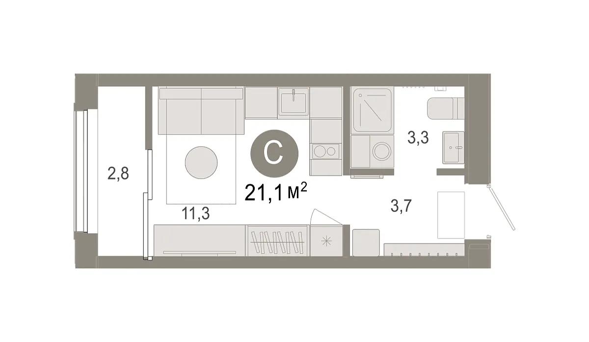 Площадь (общ/жил/кух), м2: 21.01/9.55/5.88