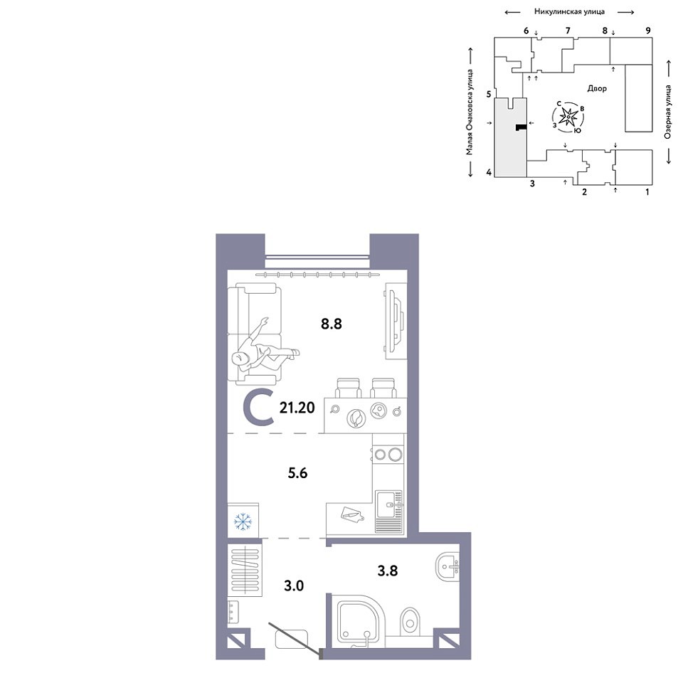 Площадь (общ/жил/кух), м2: 21.2/8.8/—