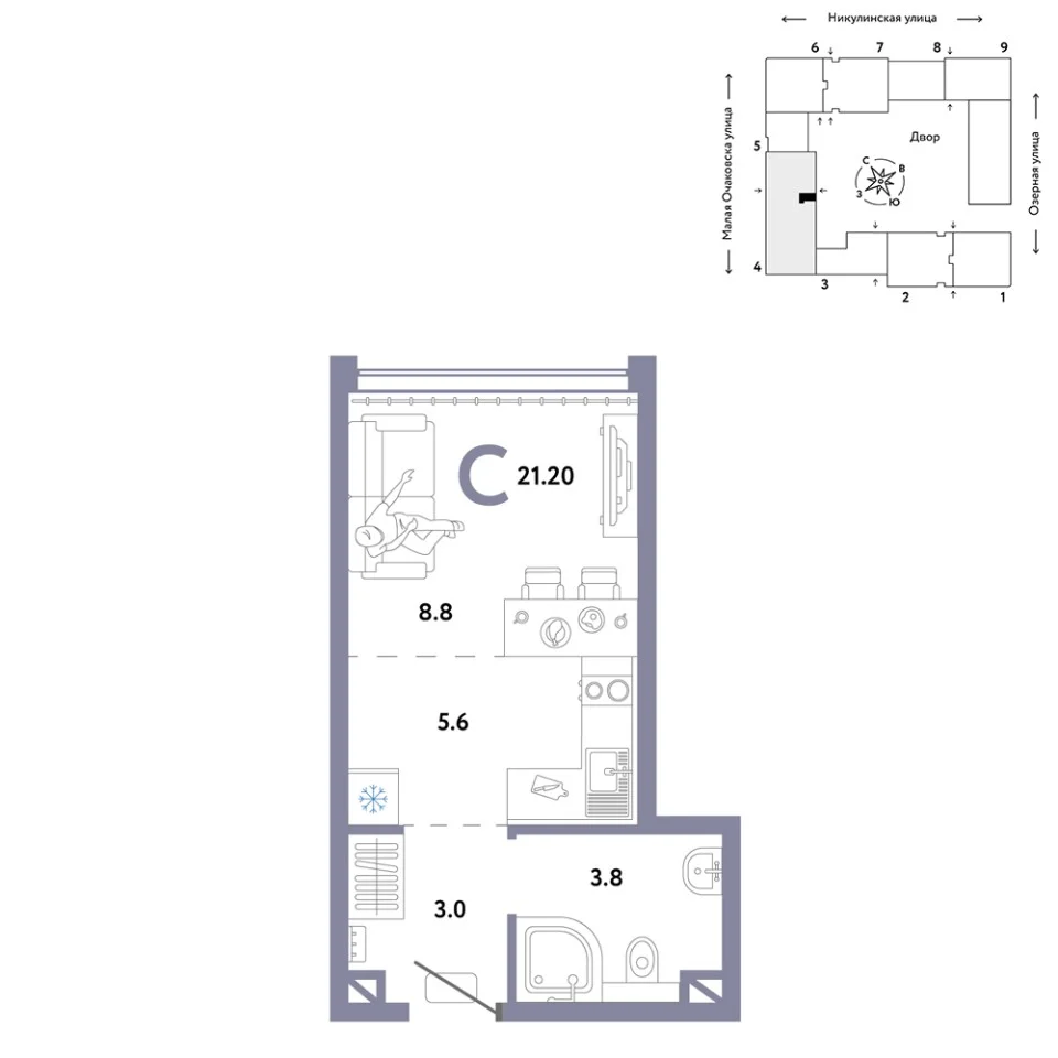 Площадь (общ/жил/кух), м2: 21.2/8.8/—