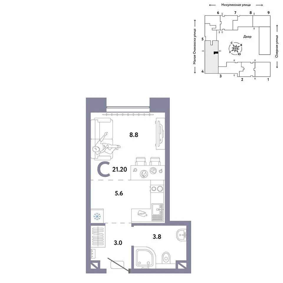Количество комнат: Студия, 21.2 кв.м.
