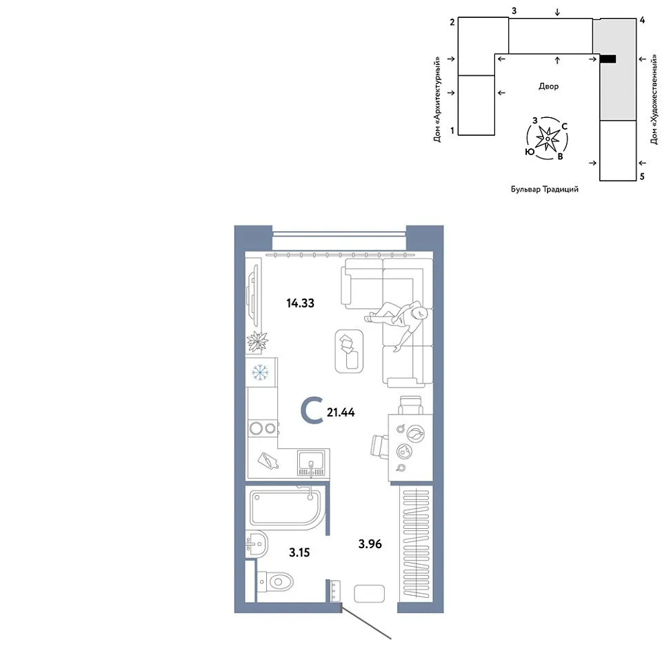 Купить новую квартиру-студию 21.44 м² на 8/15 этаже в ЖК «Домашний», г. Тюмень за 4600000 ₽ | Агентство недвижимости «Вплюсе.Топ» — Недвижимость России