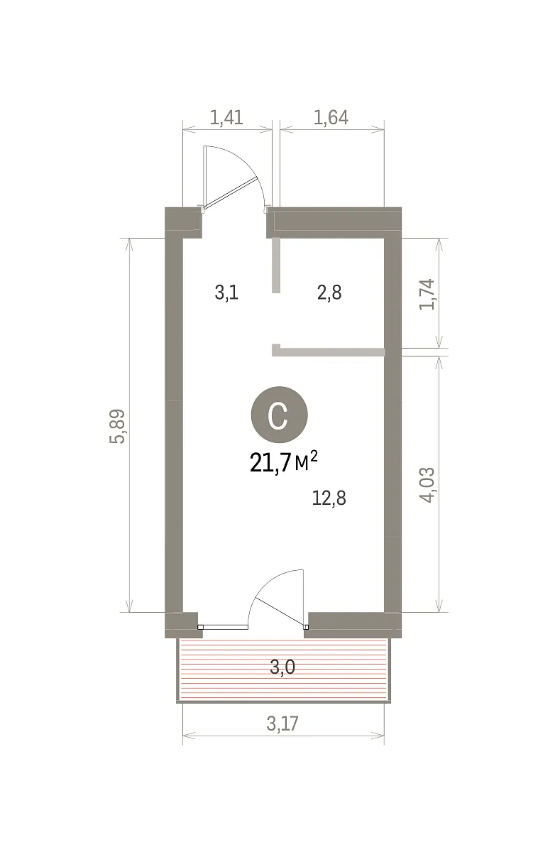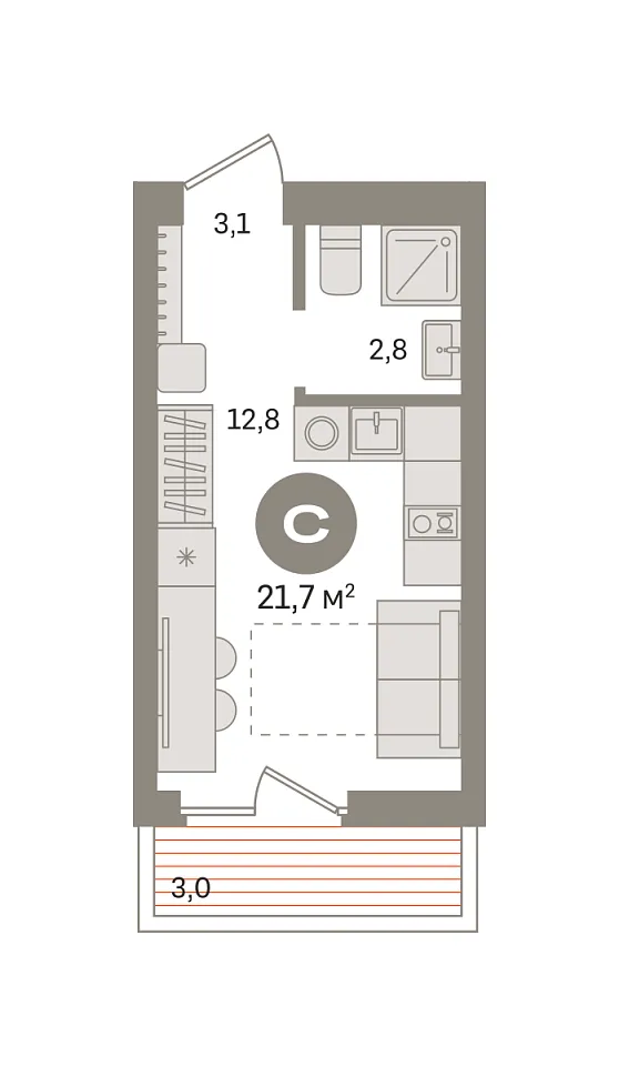 Количество комнат: Студия, 21.7 кв.м.