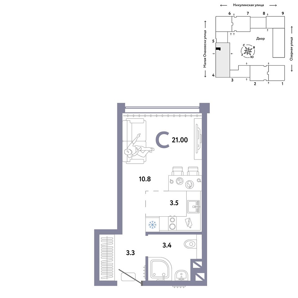 Площадь (общ/жил/кух), м2: 21/10.8/—