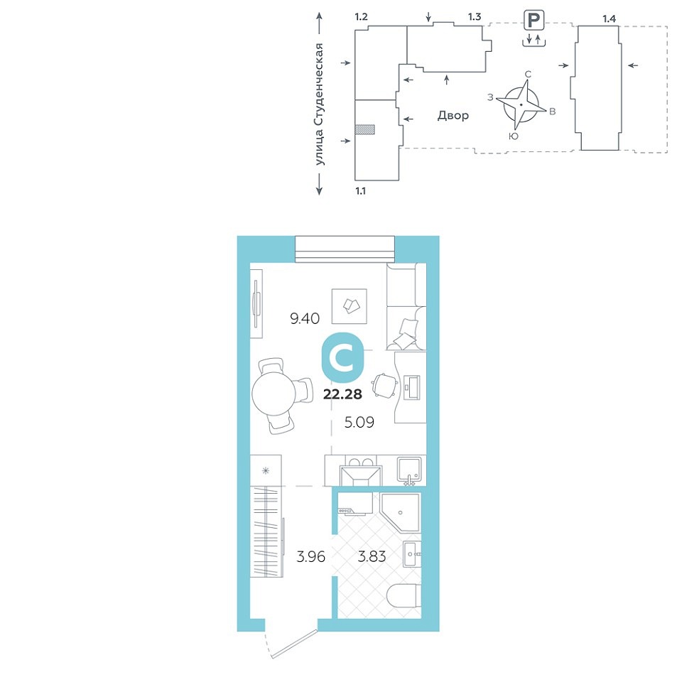 Количество комнат: Студия, 22.28 кв.м.