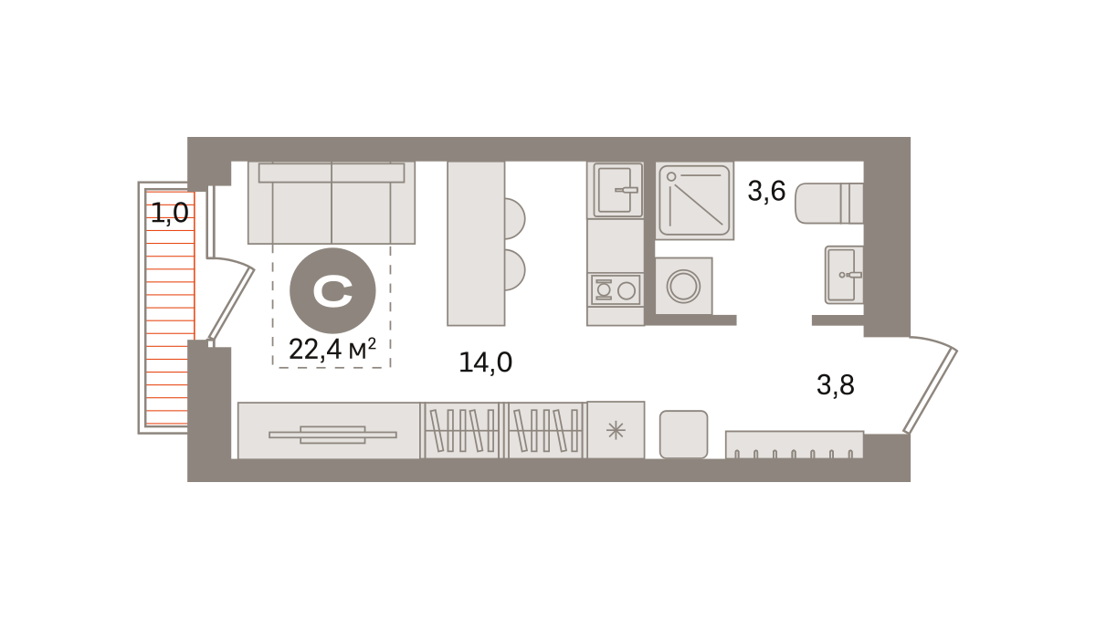 Площадь (общ/жил/кух), м2: 22.42/13.07/4.75