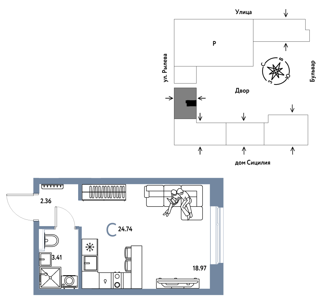 Площадь (общ/жил/кух), м2: 33.77/8.29/12.97