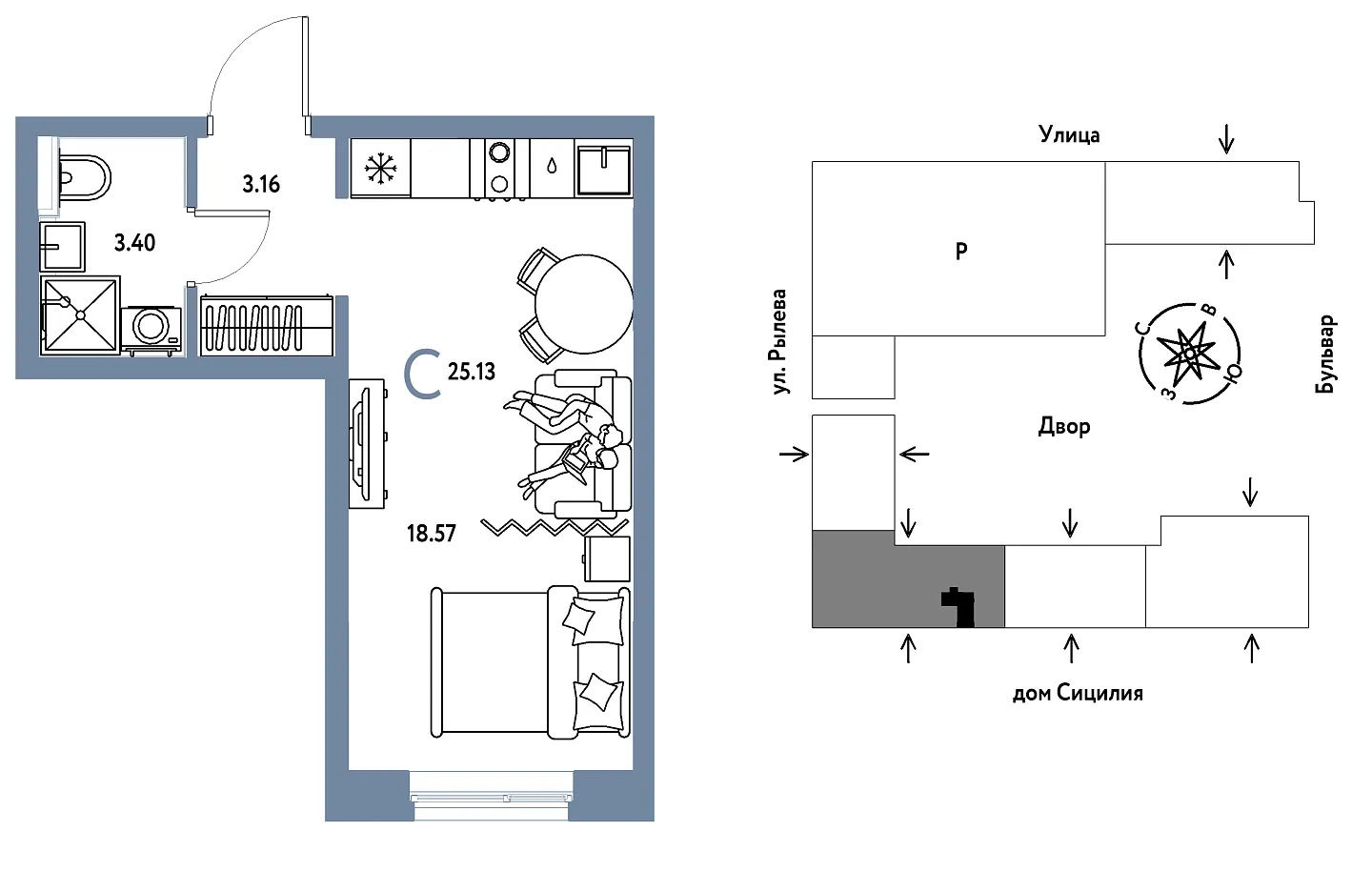 Общая площадь 25.13 м2