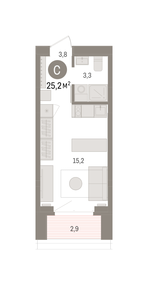 Площадь (общ/жил/кух), м2: 25.16/13.8/5.12