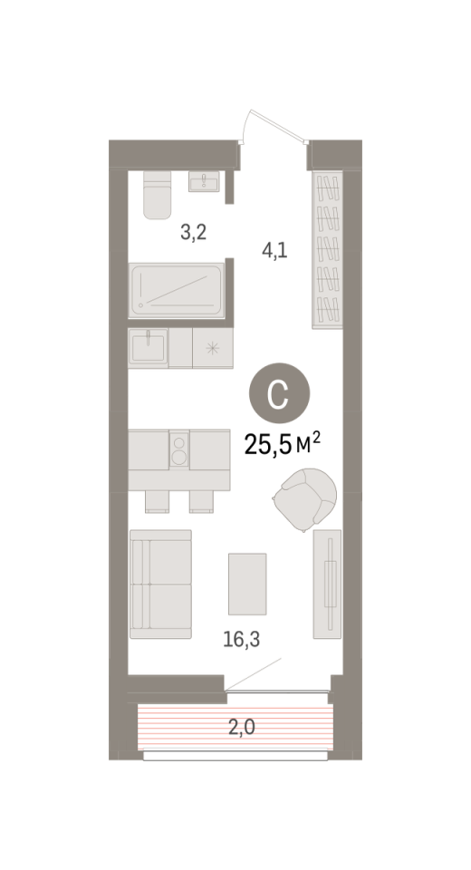 Площадь (общ/жил/кух), м2: 25.5/13.6/6.7