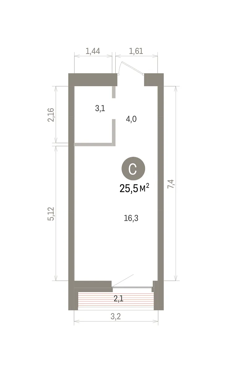 Площадь (общ/жил/кух), м2: 25.5/13.6/6.7