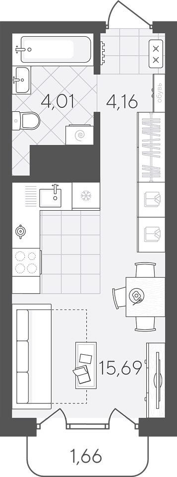 Площадь (общ/жил/кух), м2: 19.89/14.21/2.01
