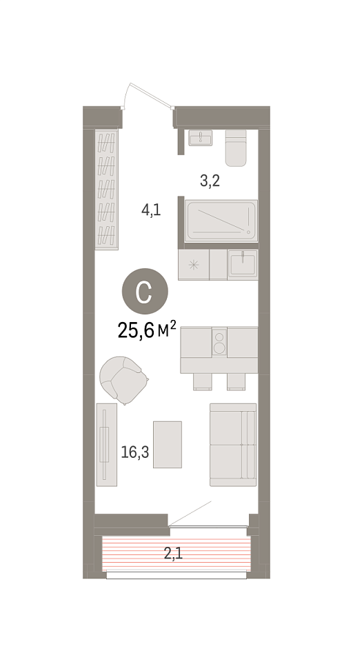 Количество комнат: Студия, 25.6 кв.м.
