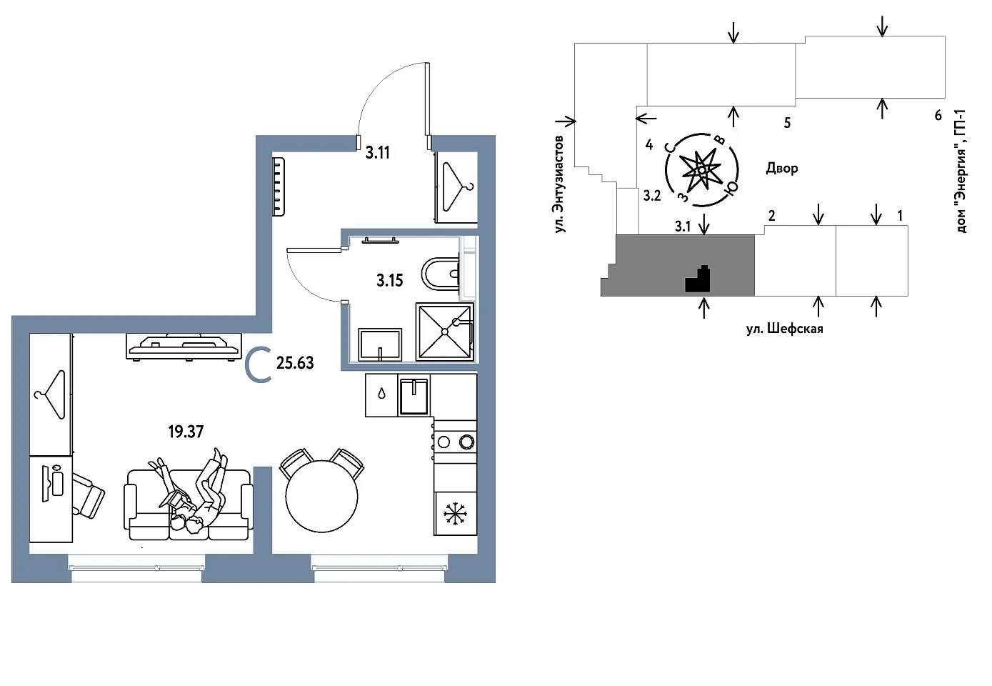 Общая площадь 25.63 м2