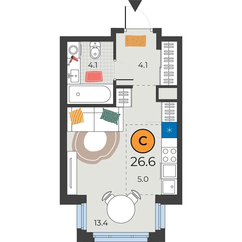 Площадь (общ/жил/кух), м2: 26.6/13.4/—