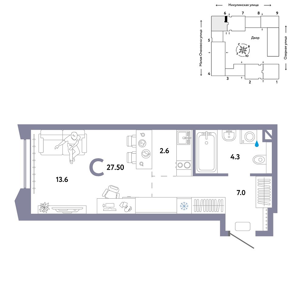 Площадь (общ/жил/кух), м2: 27.5/13.6/—