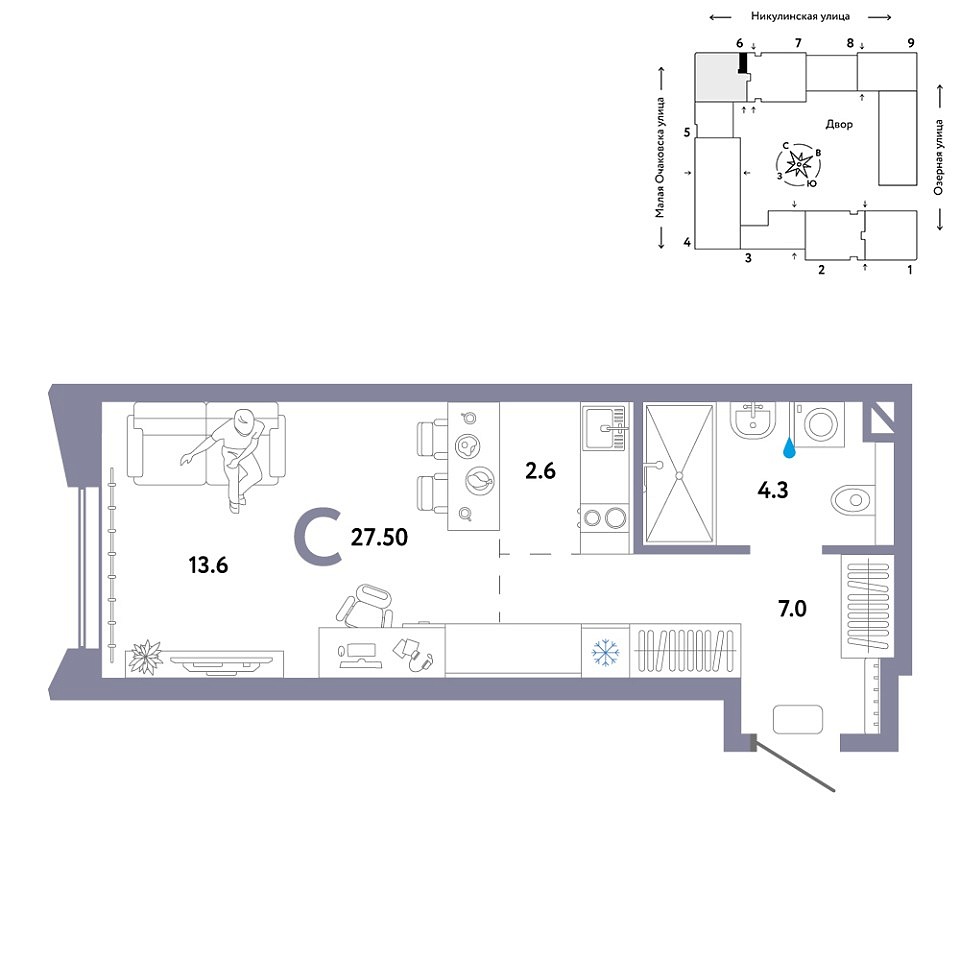 Площадь (общ/жил/кух), м2: 27.5/13.6/—