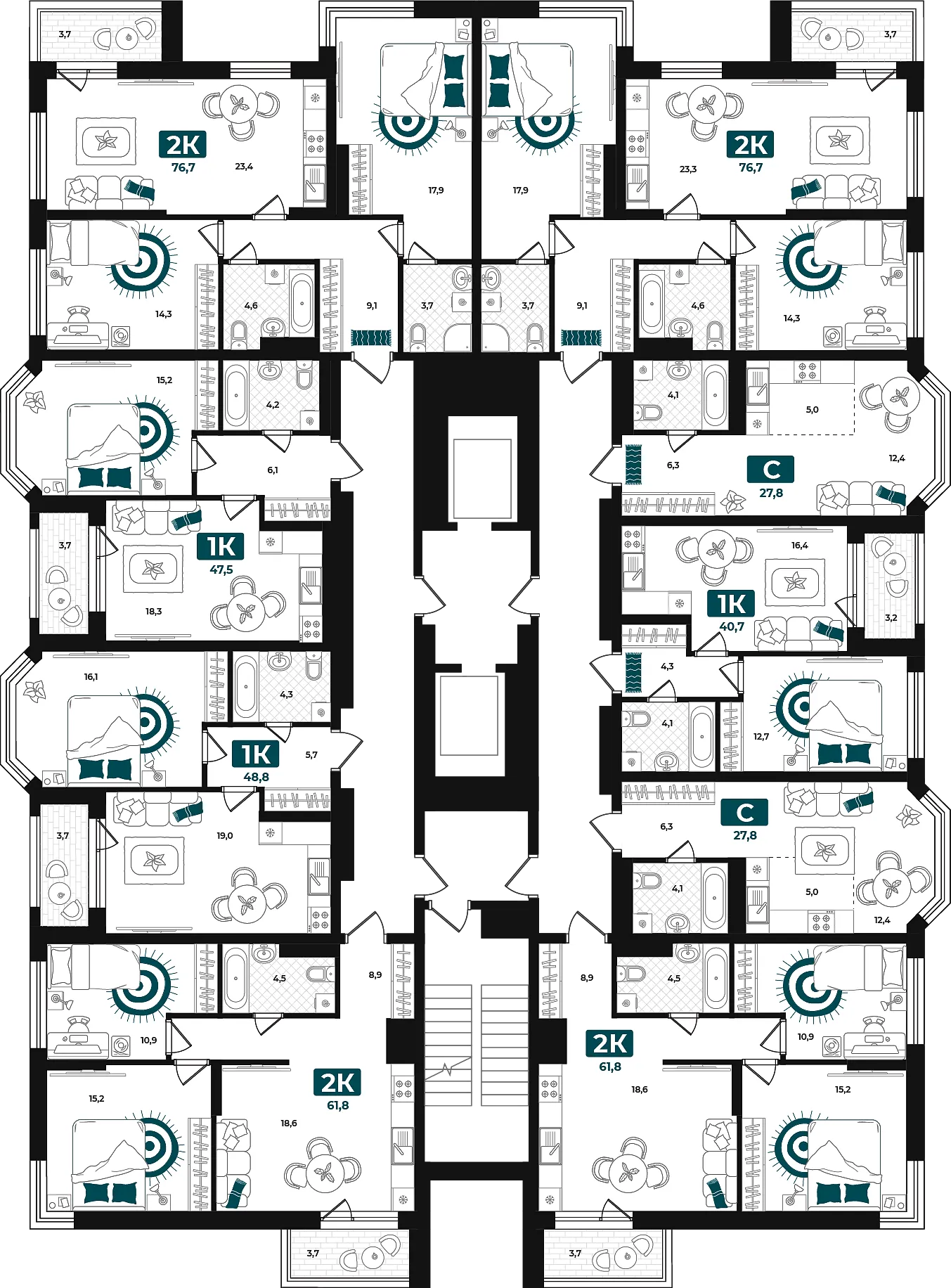 Площадь (общ/жил/кух), м2: 27.7/12.4/—