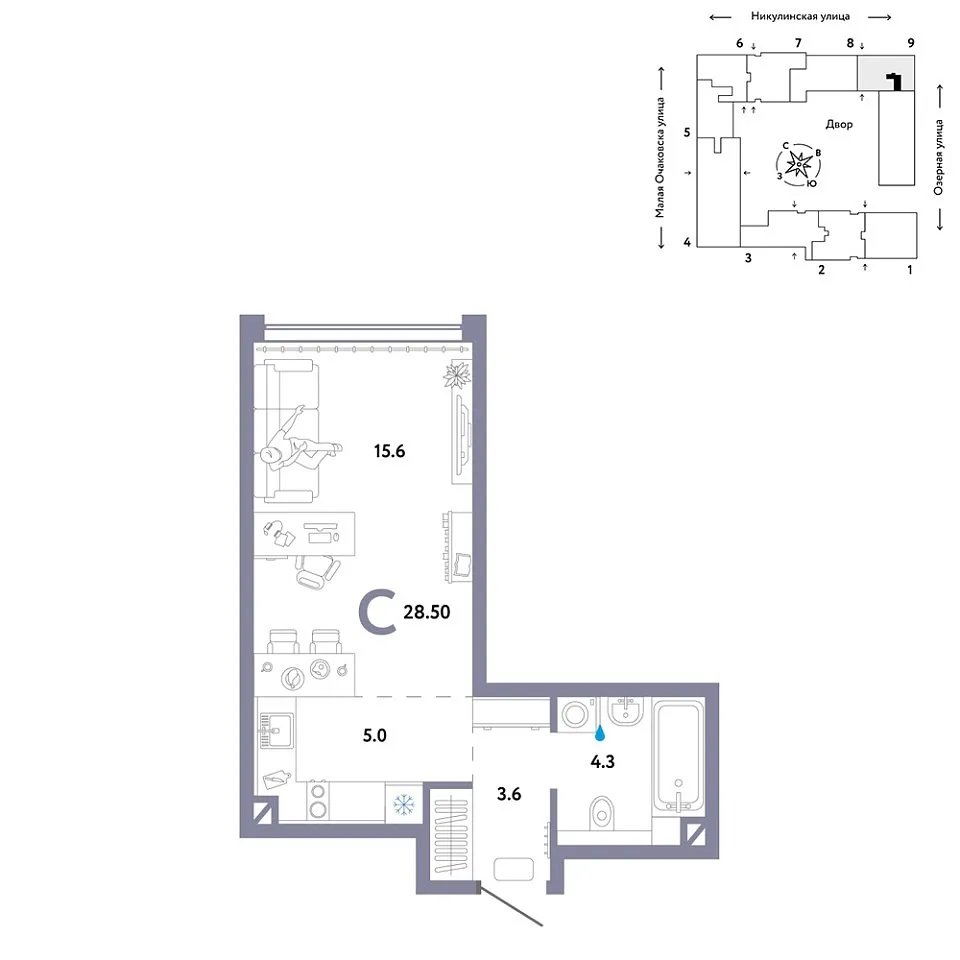 Площадь (общ/жил/кух), м2: 28.5/15.6/—
