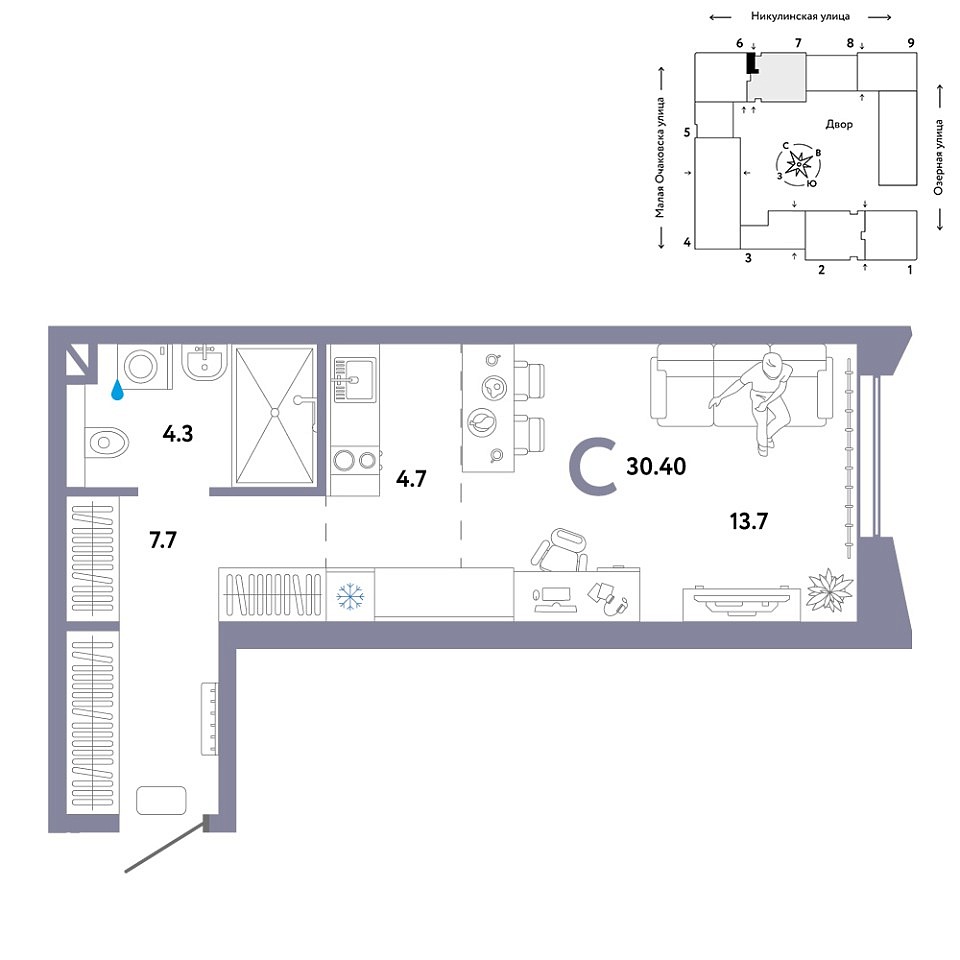 Площадь (общ/жил/кух), м2: 30.4/13.7/—