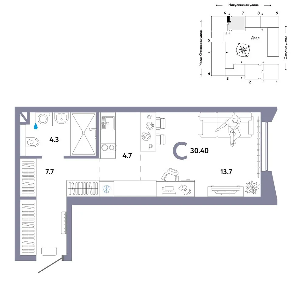 Количество комнат: Студия, 30.4 кв.м.