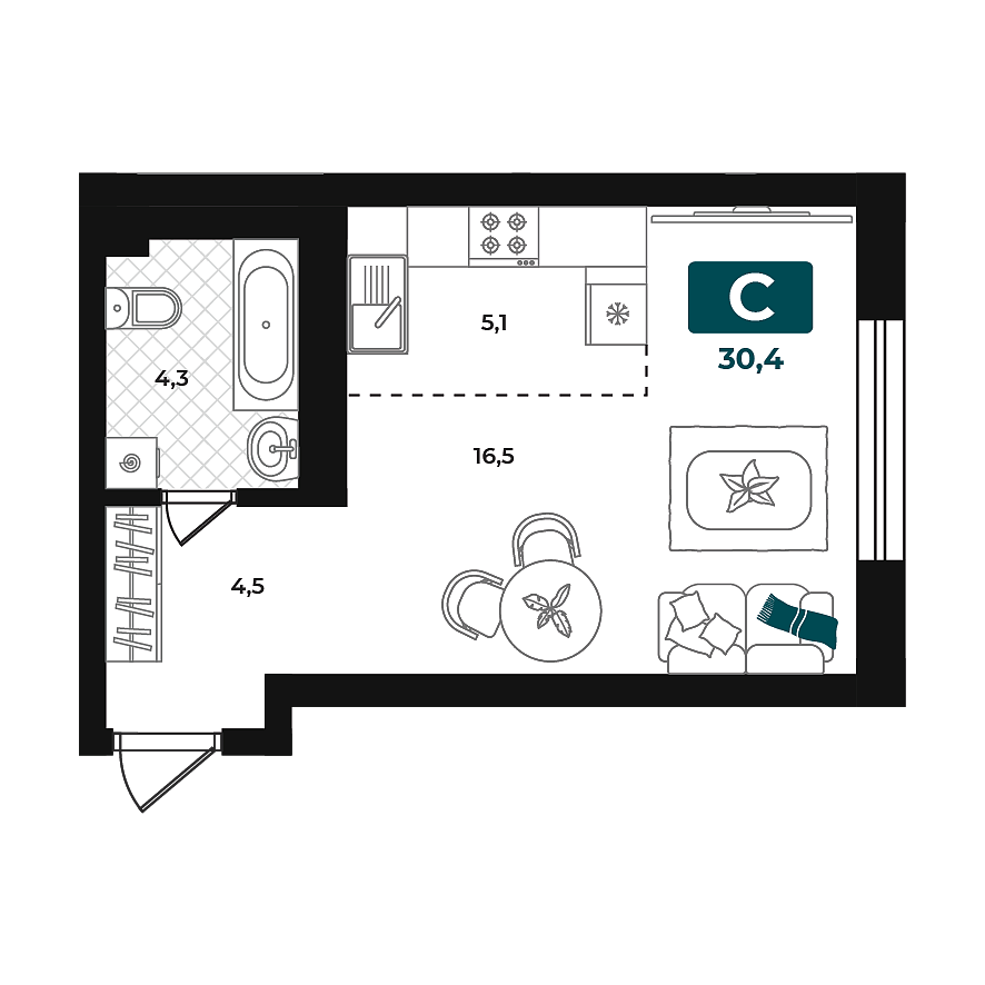 Площадь (общ/жил/кух), м2: 30.4/16.5/—