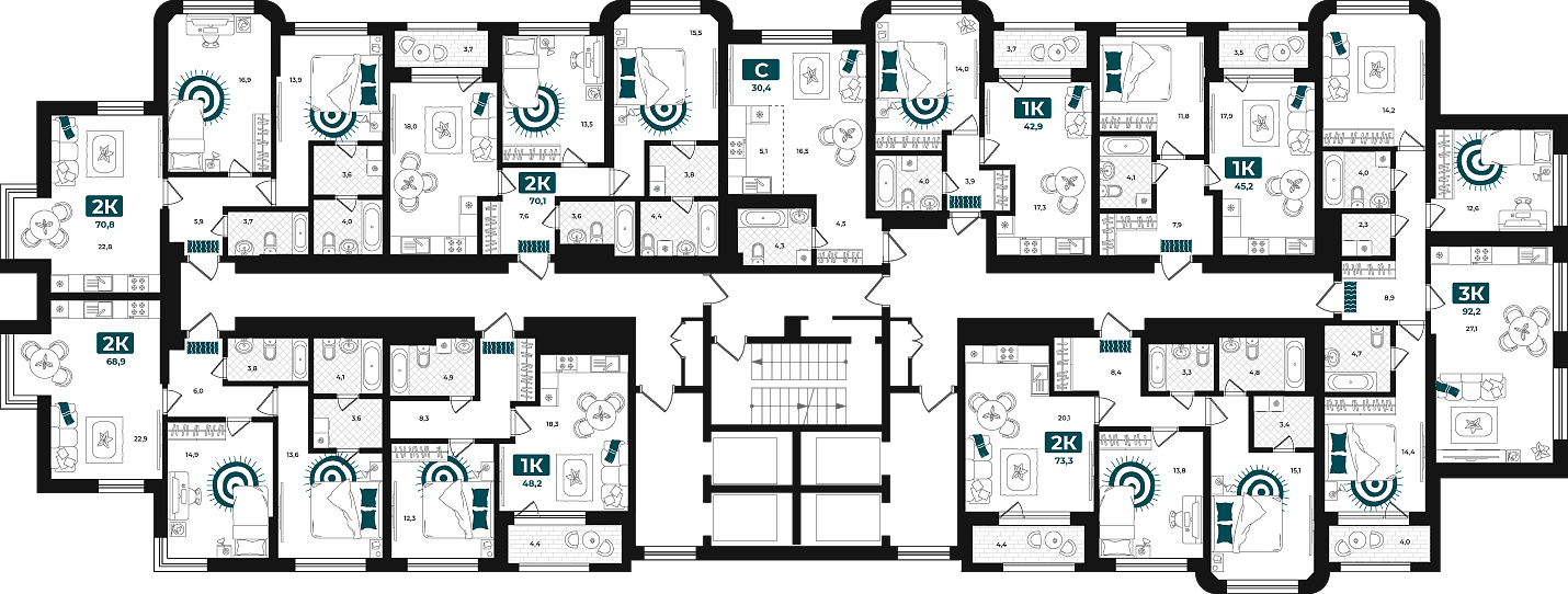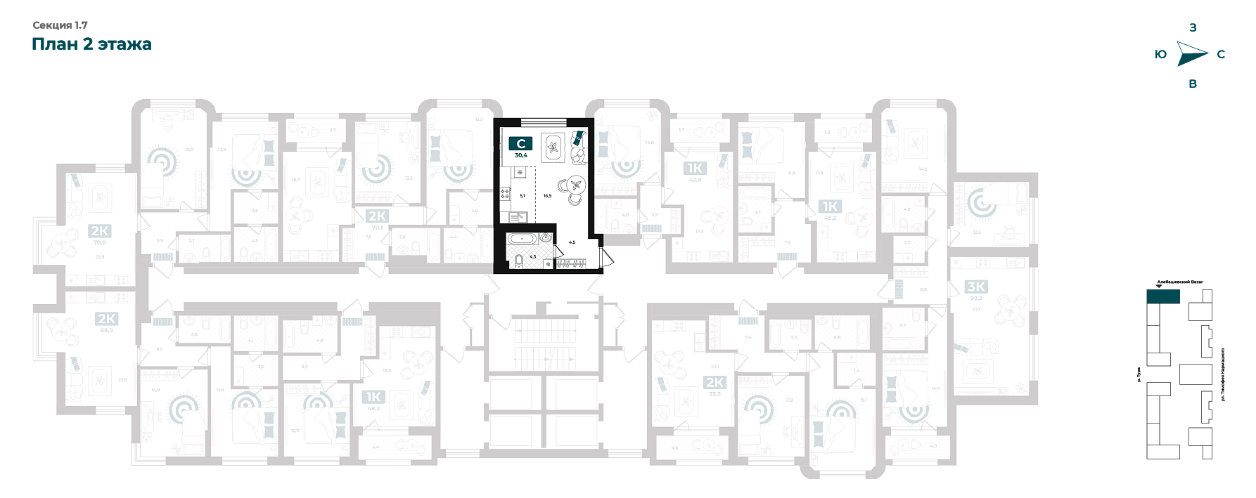 Площадь (общ/жил/кух), м2: 30.8/16.9/—