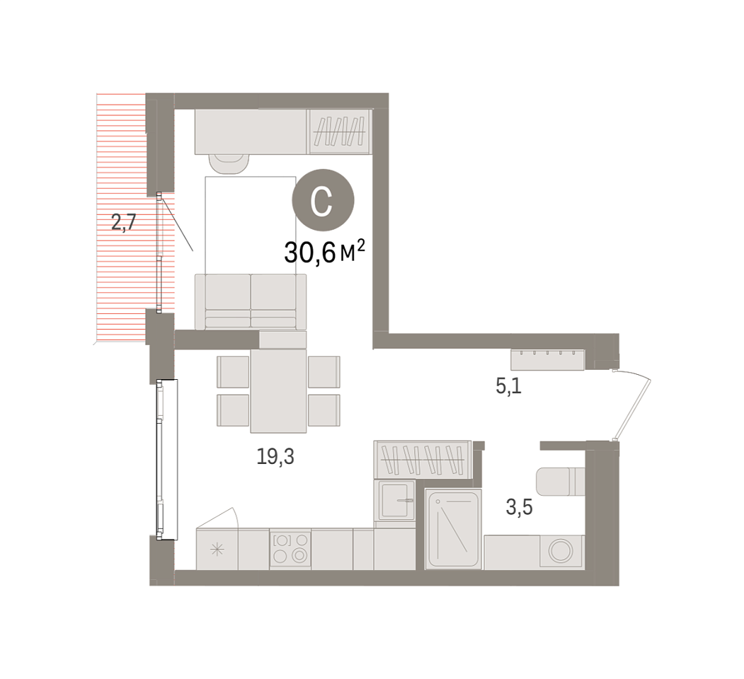 Площадь (общ/жил/кух), м2: 30.6/19.9/4.5