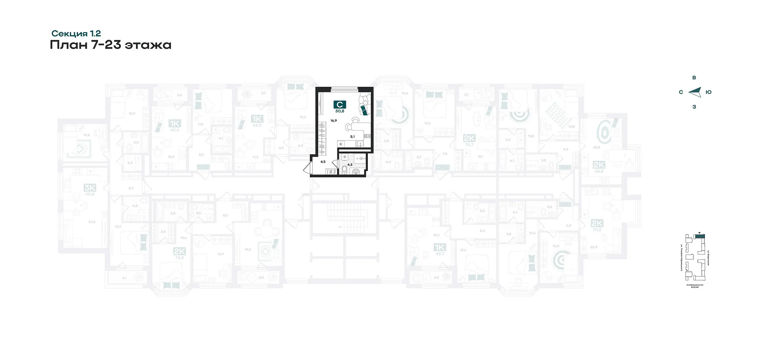 Количество комнат: Студия, 30.8 кв.м.
