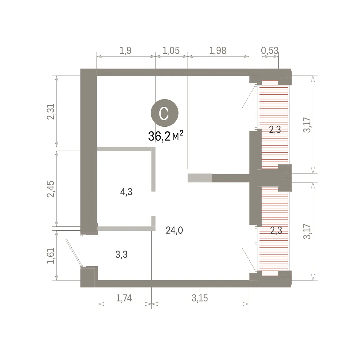Площадь (общ/жил/кух), м2: 25.16/13.8/5.12