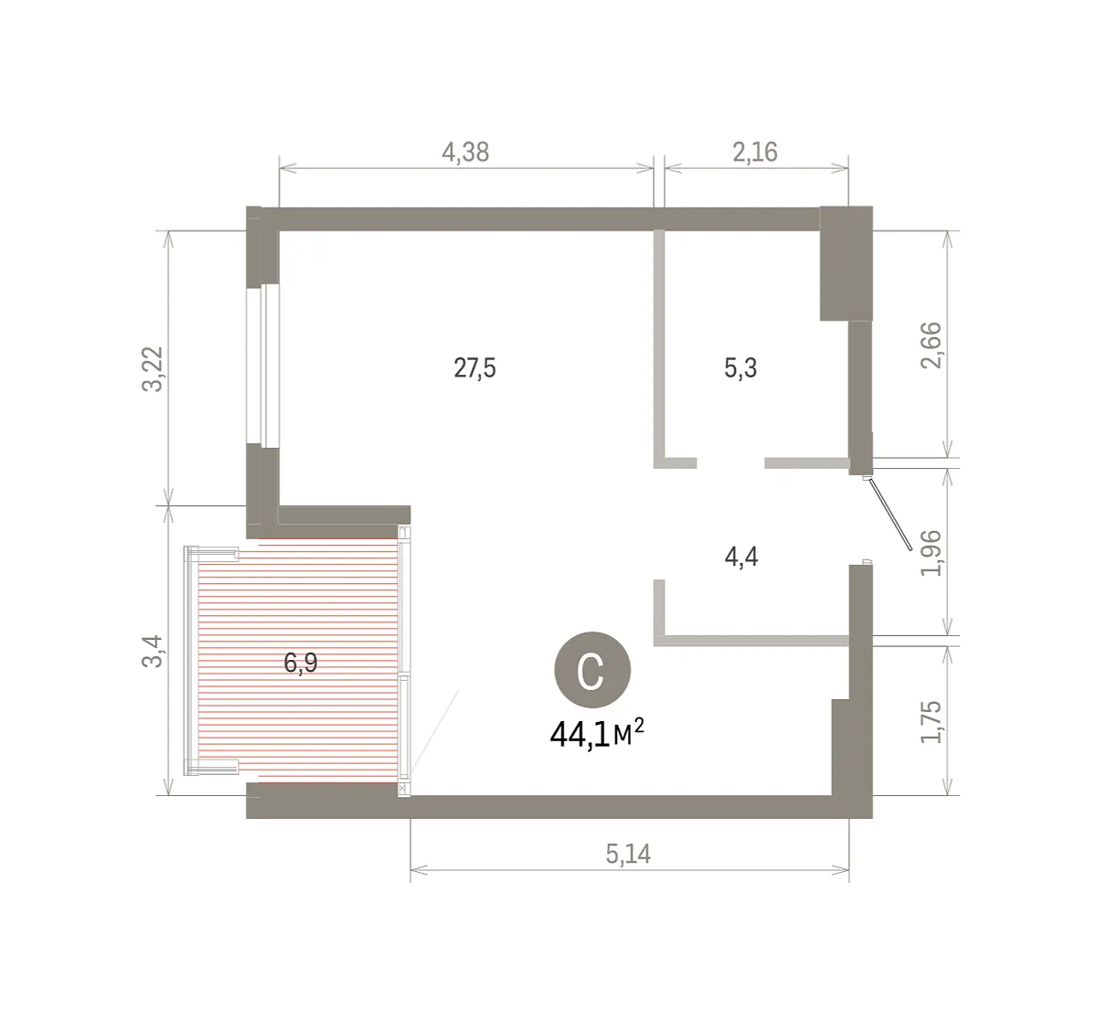 Общая площадь 44.12 м2