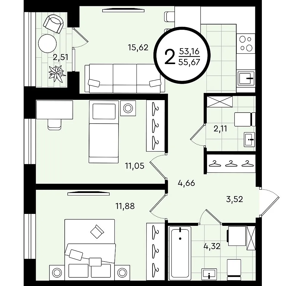 Общая площадь 55.67 м2
