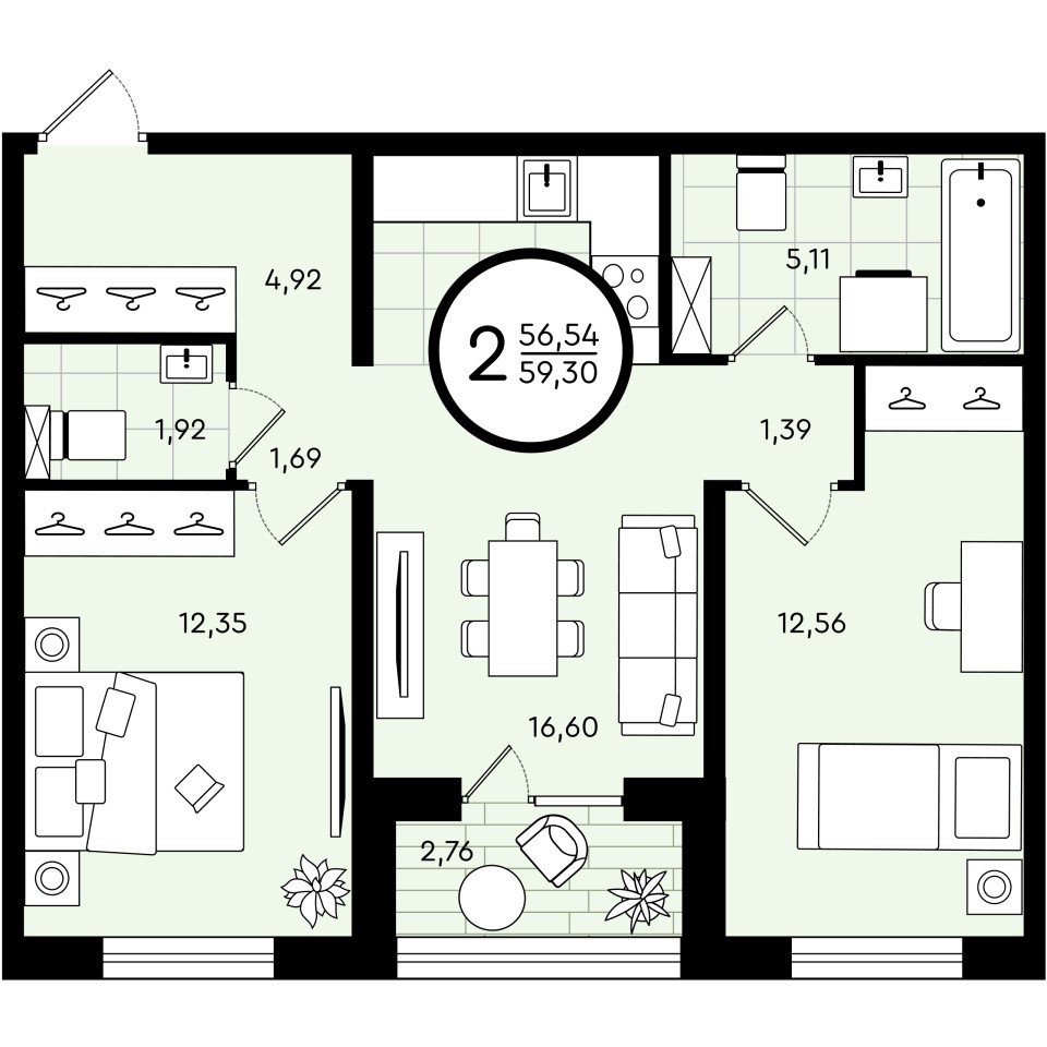 Площадь (общ/жил/кух), м2: 56.1/19.89/—