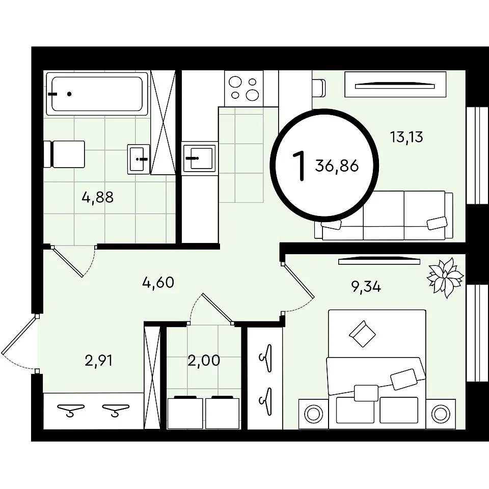 Площадь (общ/жил/кух), м2: 36.86/9.34/—