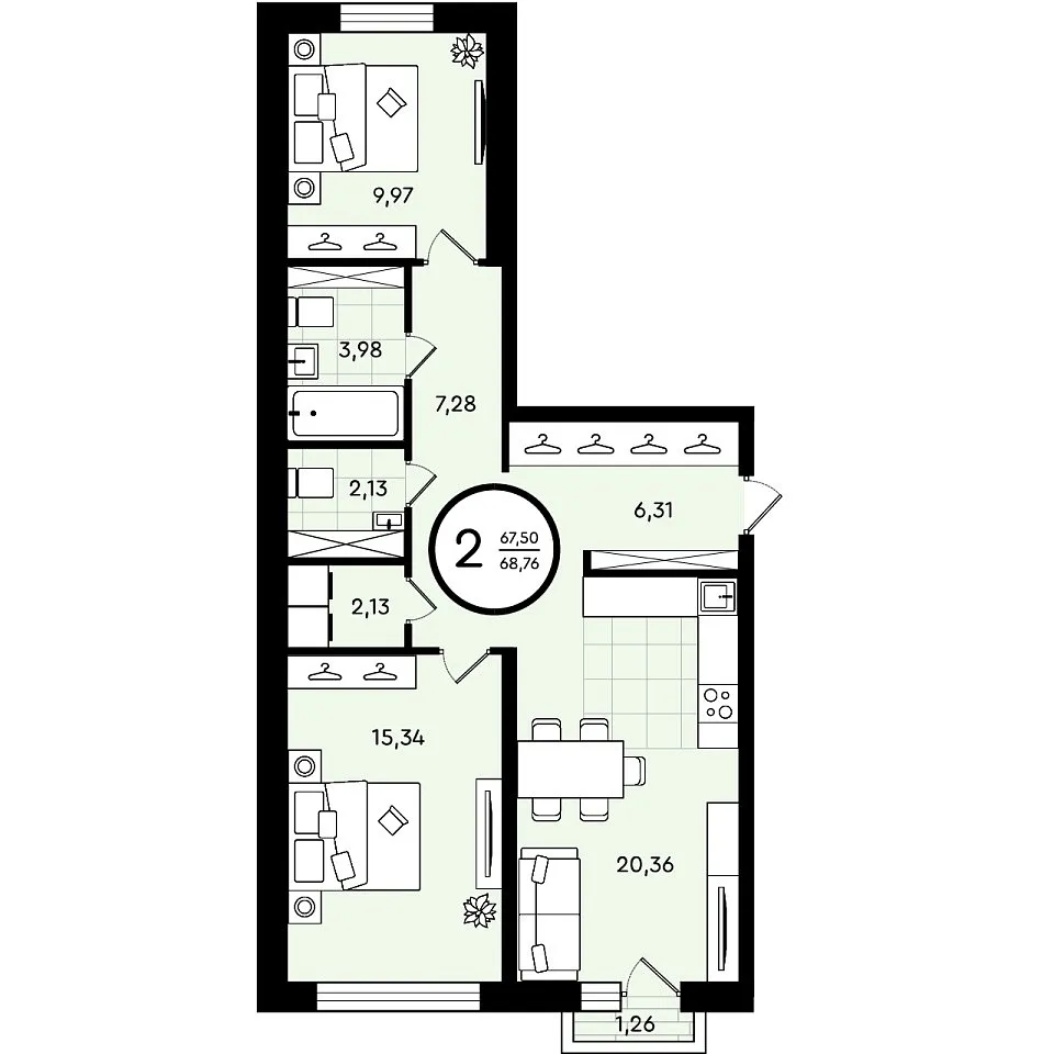 Площадь (общ/жил/кух), м2: 65.7/20.6/—