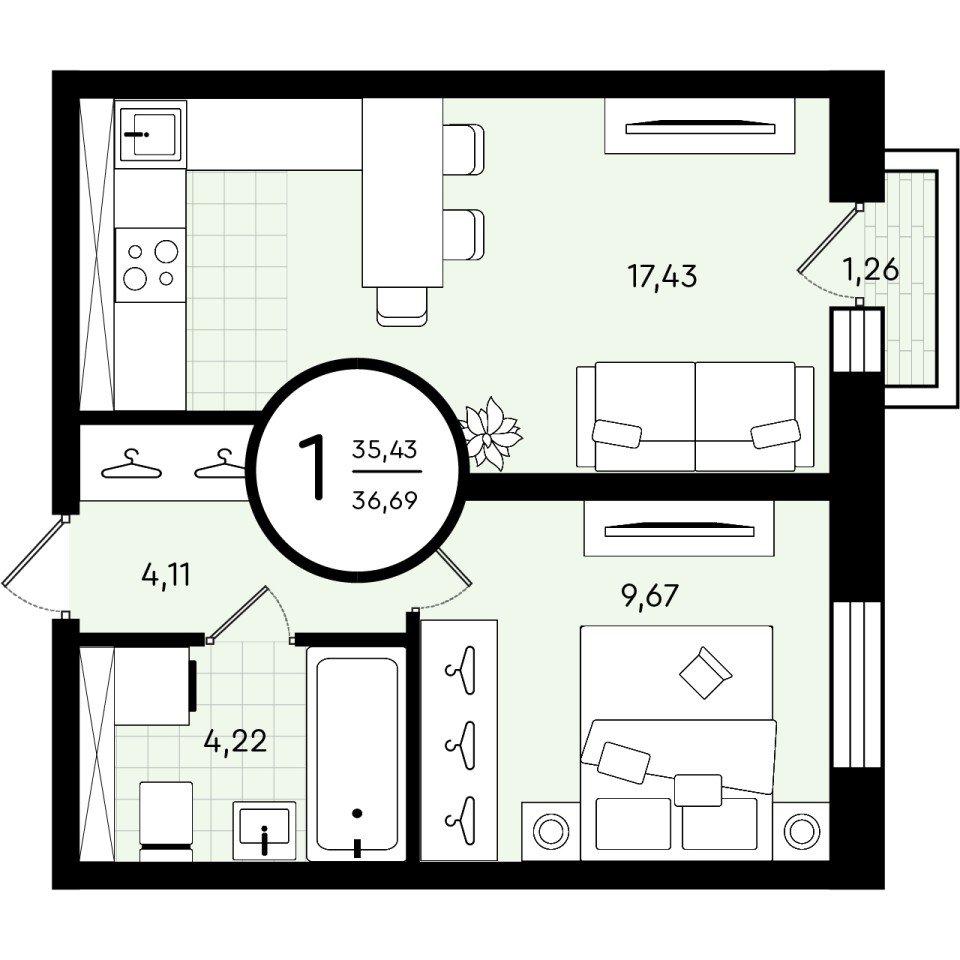 Площадь (общ/жил/кух), м2: 36.4/15.22/—